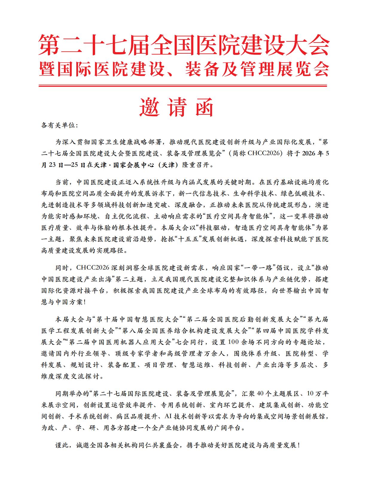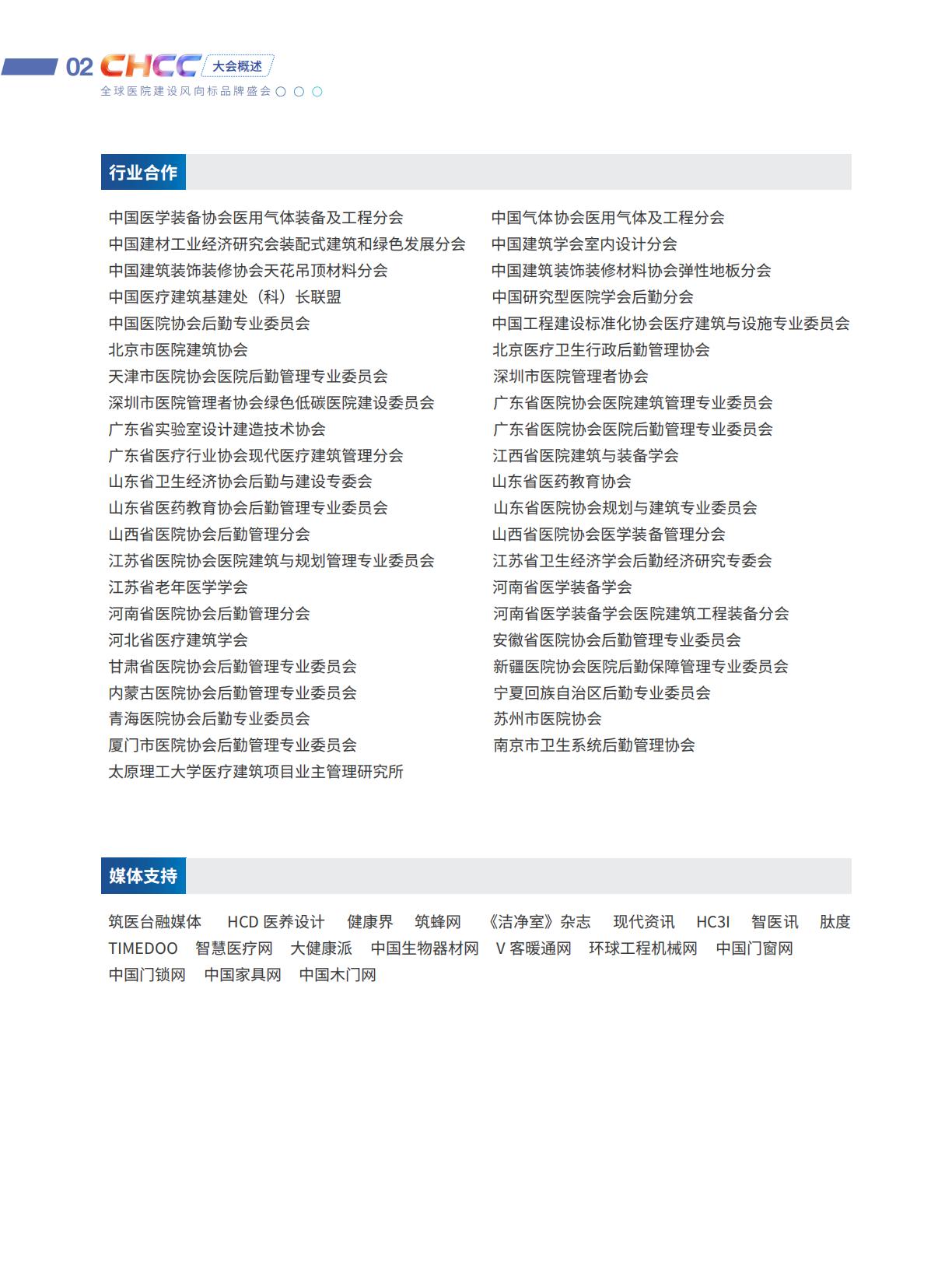 行业合作 中国医学装备协会医用气体装备及工程分会 中国气体协会医用气体及工程分会 中国建材工业经济研究会装配式建筑和绿色发展分会 中国建筑学会室内设计分会 中国建筑装饰装修协会天花吊顶材料分会 中国建筑装饰装修材料协会弹性地板分会 中国医疗建筑基建处(科)长联盟 中国研究型医院学会后勤分会 中国医院协会后勤专业委员会 中国工程建设标准化协会医疗建筑与设施专业委员会 北京市医院建筑协会 北京医疗卫生行政后勤管理协会 天津市医院协会医院后勤管理专业委员会 深圳市医院管理者协会 深圳市医院管理者协会绿色低碳医院建设委员会 广东省医院协会医院建筑管理专业委员会 广东省实验室设计建造技术协会 广东省医院协会医院后勤管理专业委员会 广东省医疗行业协会现代医疗建筑管理分会 江西省医院建筑与装备学会 山东省卫生经济协会后勤与建设专委会 山东省医药教育协会 山东省医药教育协会后勤管理专业委员会 山东省医院协会规划与建筑专业委员会 山西省医院协会后勤管理分会 山西省医院协会医学装备管理分会 江苏省医院协会医院建筑与规划管理专业委员会 江苏省卫生经济学会后勤经济研究专委会 江苏省老年医学学会河南省医学装备学会 河南省医院协会后勤管理分会 河南省医学装备学会医院建筑工程装备分会 河北省医疗建筑学会 安徽省医院协会后勤管理专业委员会 甘肃省医院协会后勤管理专业委员会 新疆医院协会医院后勤保障管理专业委员会 内蒙古医院协会后勤管理专业委员会 宁夏回族自治区后勤专业委员会 青海医院协会后勤专业委员会 苏州市医院协会 厦门市医院协会后勤管理专业委员会 南京市卫生系统后勤管理协会 太原理工大学医疗建筑项目业主管理研究所 媒体支持 筑医台融媒体 HCD 医养设计 健康界 筑蜂网 《洁净室》杂志 现代资讯 HC3I 智医讯 肽度TIMEDOO 智慧医疗网 大健康派 中国生物器材网 V 客暖通网 环球工程机械网 中国门窗网 中国门锁网 中国家具网 中国木门网